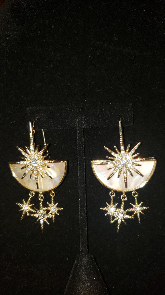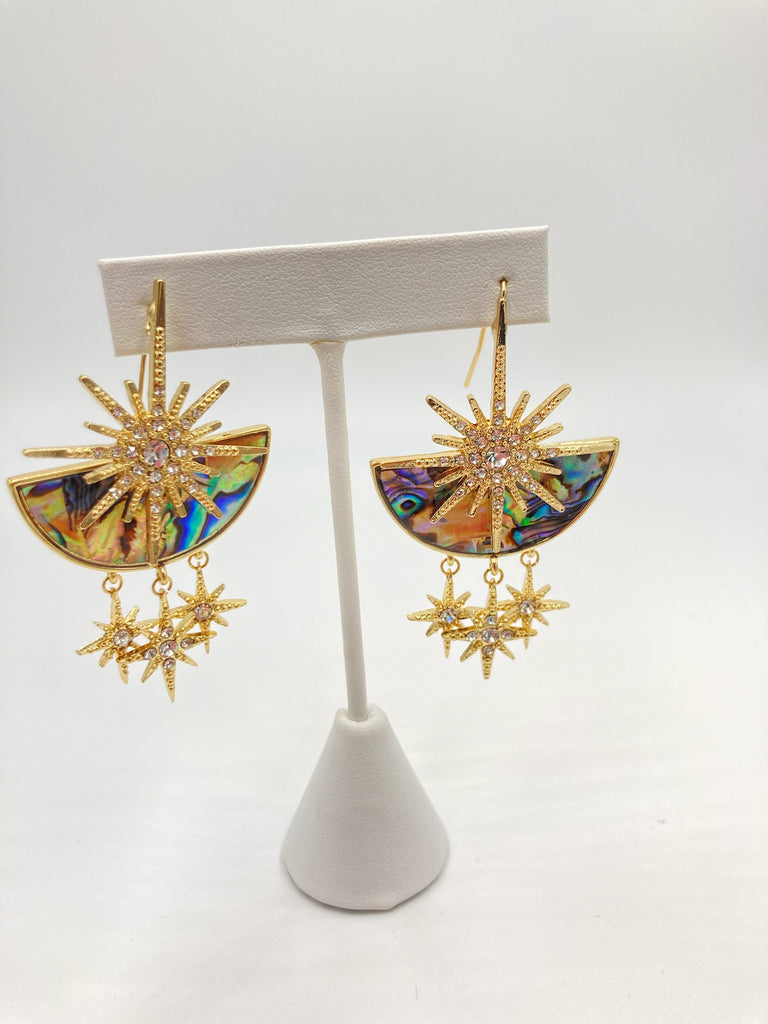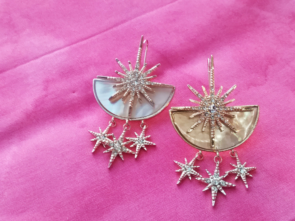 Iridescent and gold earrings with hanging stars with stone embellishments