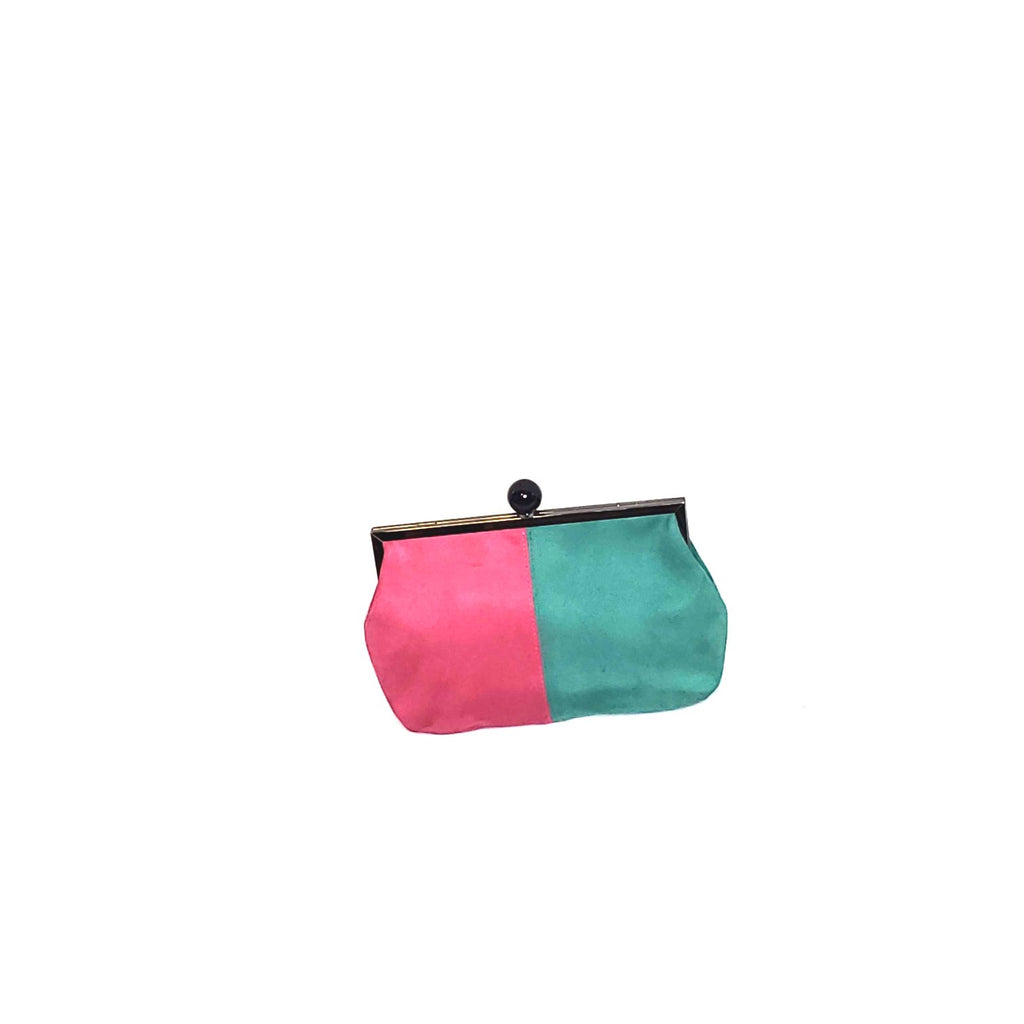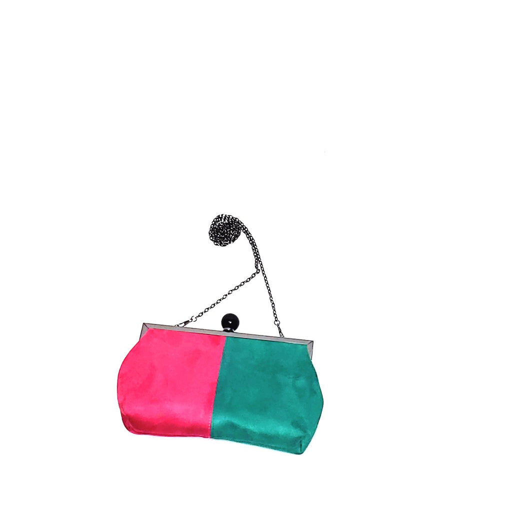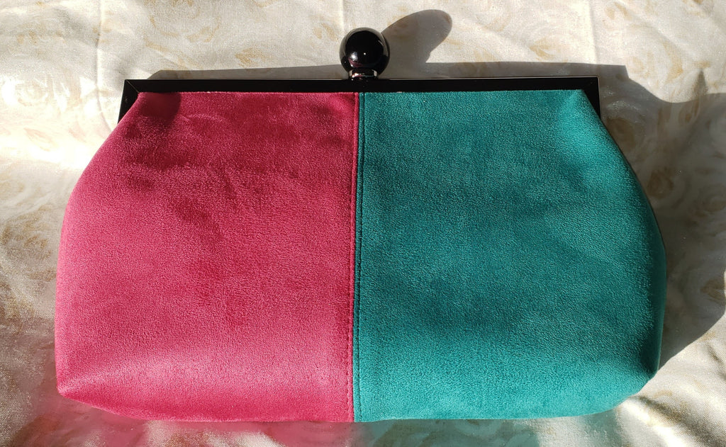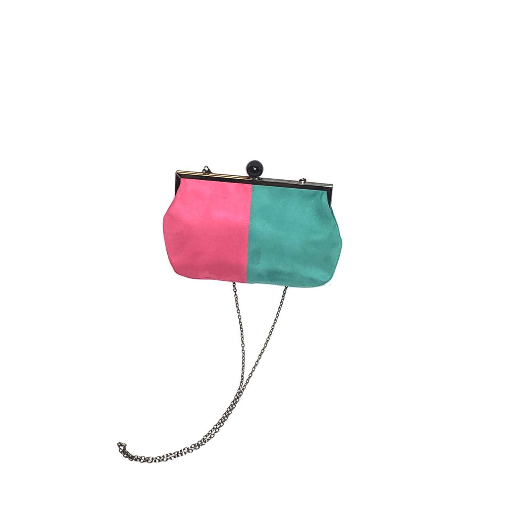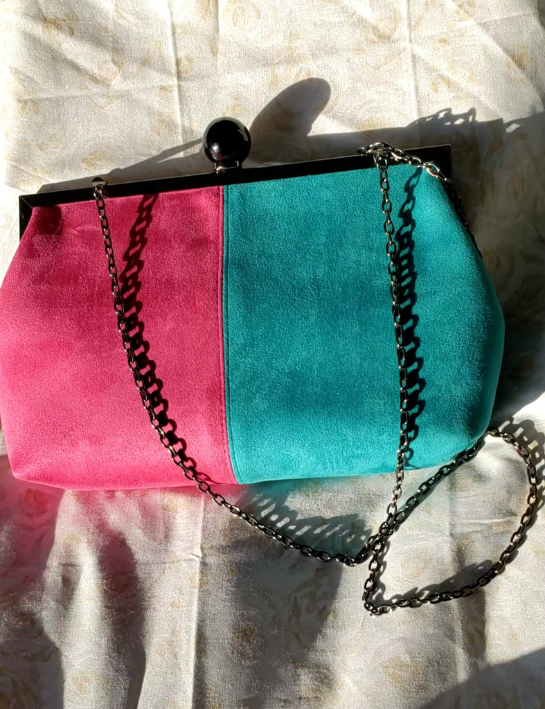 This one of a kind pink and sea green suede color-block purse comes with an optional charcoal chain-link strap. It can be worn as a clutch or over the shoulder.