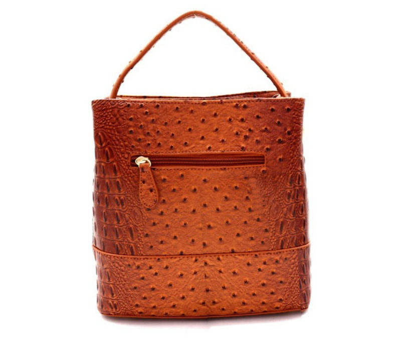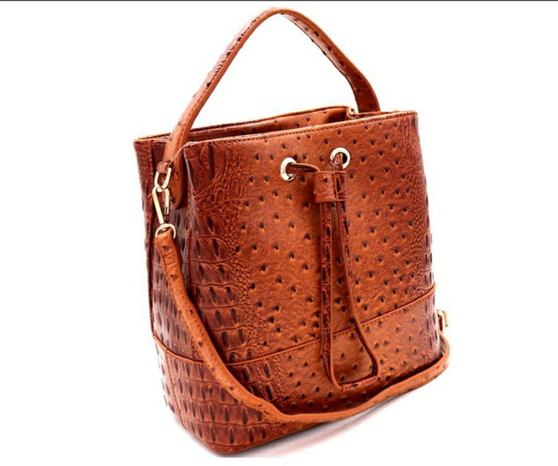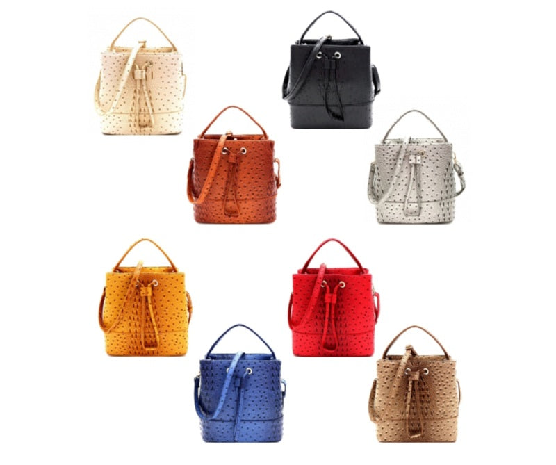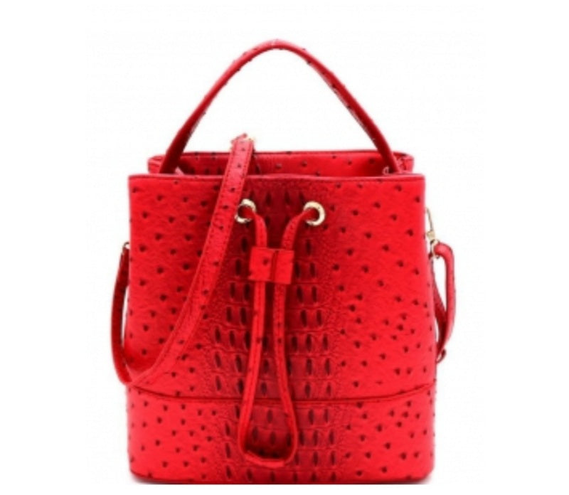 Small faux ostrich leather bucket bag. Can be carried as a crossbody, on the shoulder or by hand! This chic handbag transitions well from the office to date night!! These small bags have the perfect pop of color and beautiful texture which makes for a statement purse!