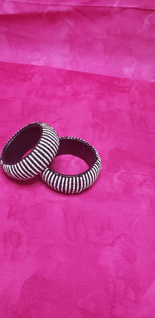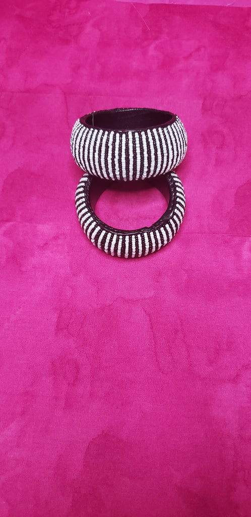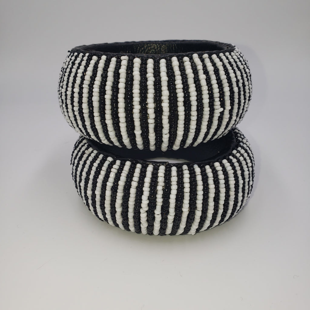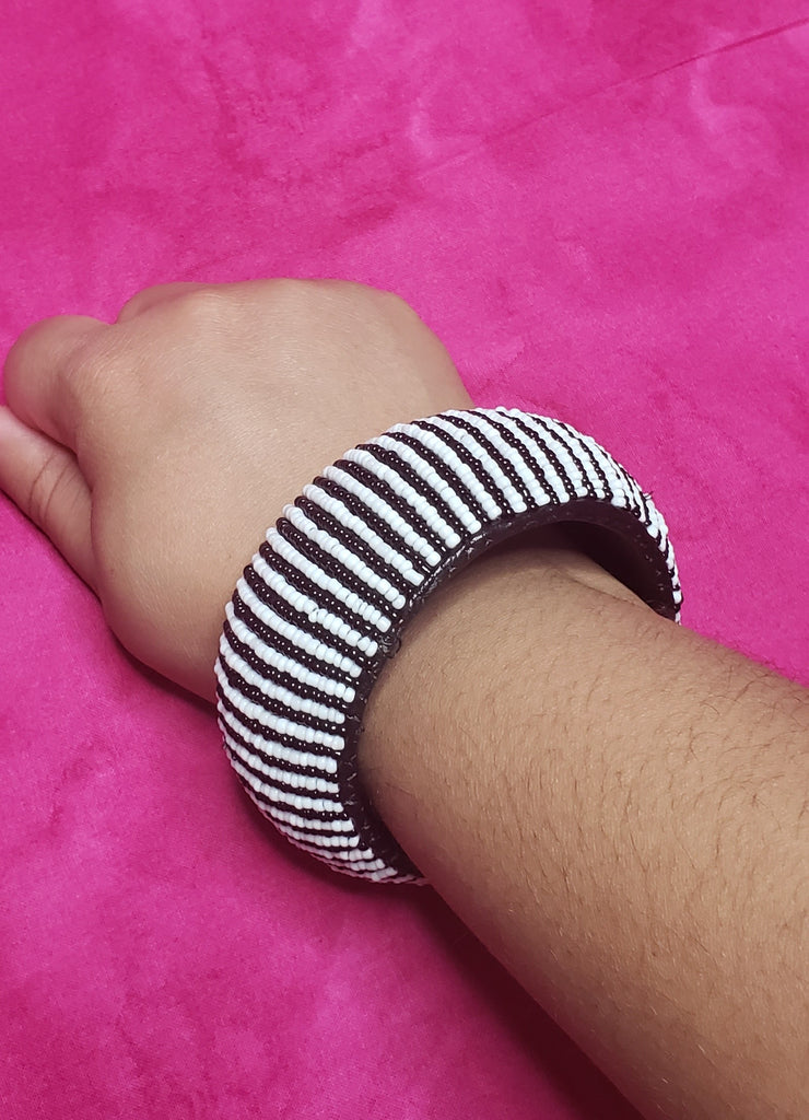 Black and white beaded bangle block bracelet with black faux leather on inside band.