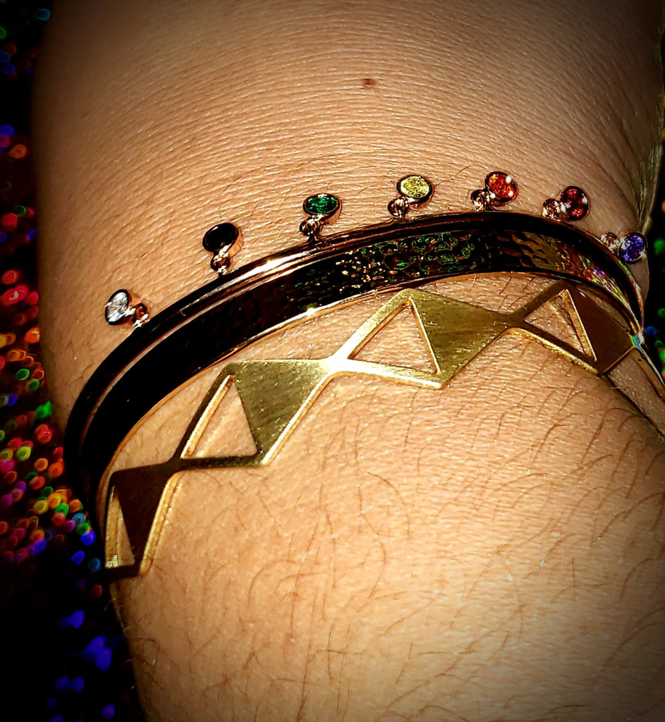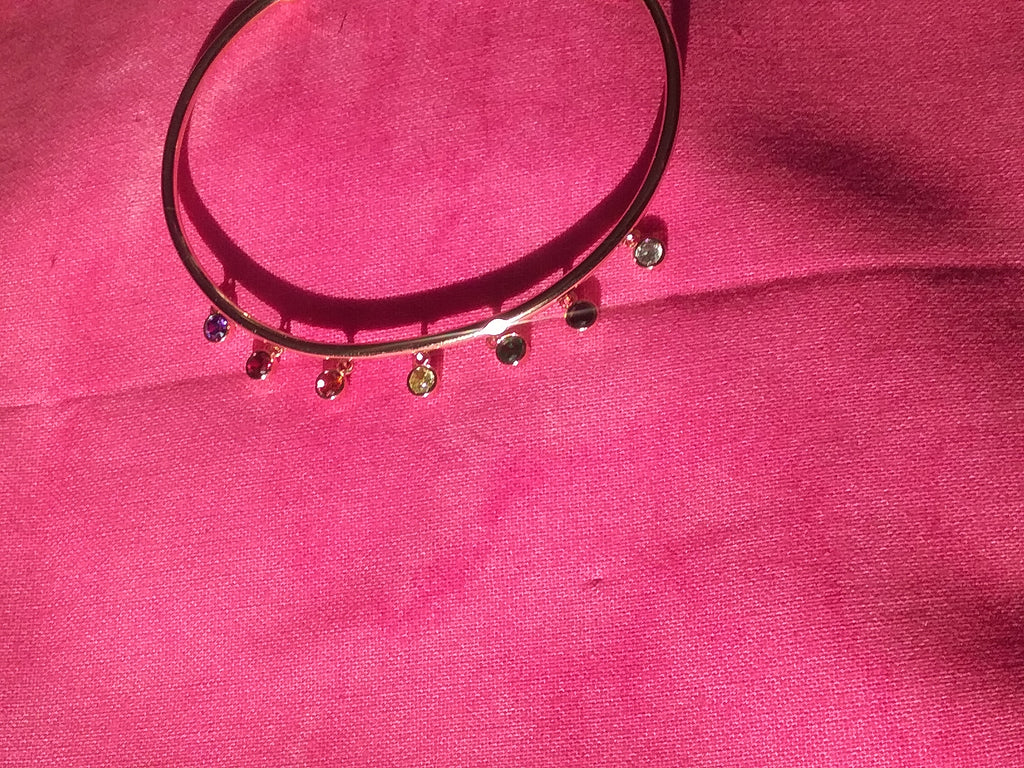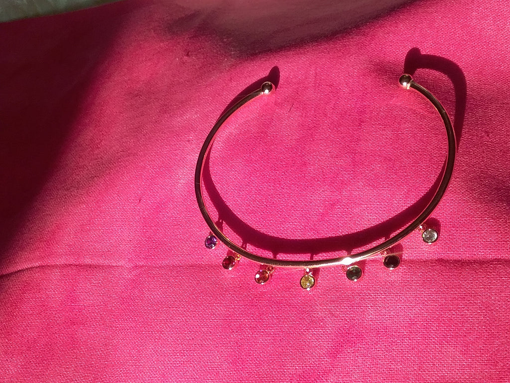 Gold adjustable and stackable bangle bracelet with multi colored hanging gemstones