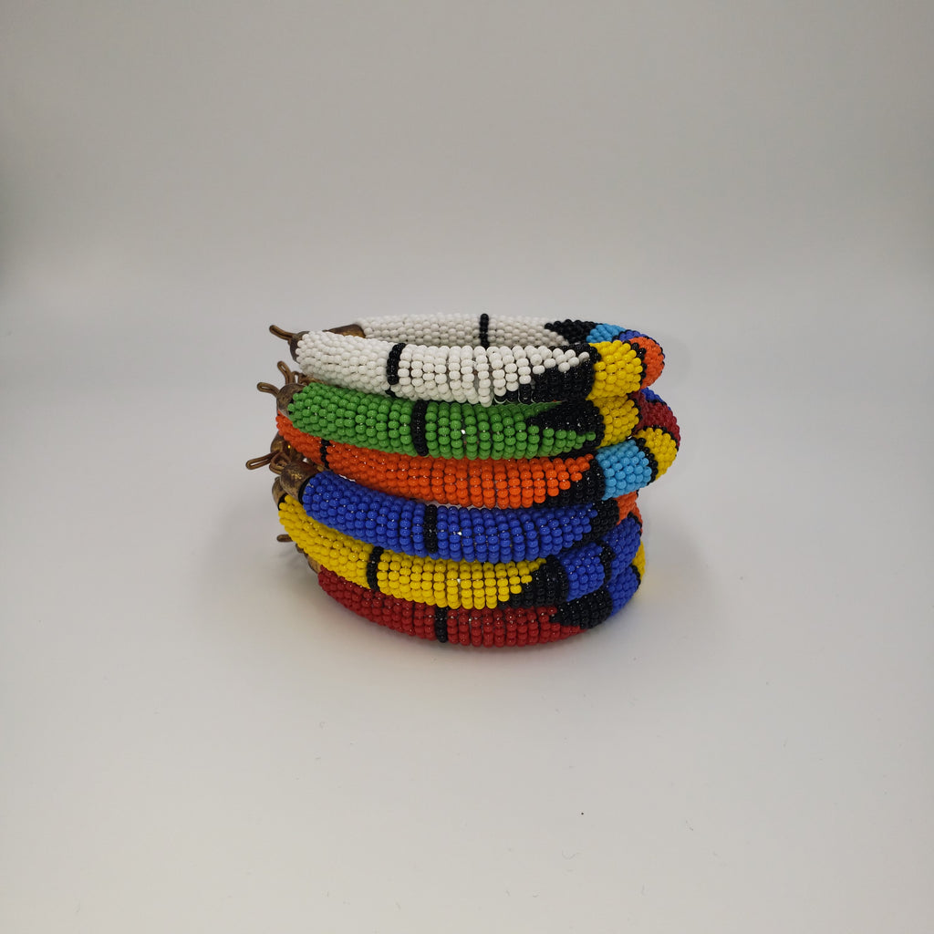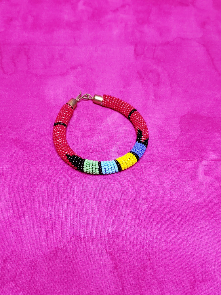 Beaded bangle bracelet with brass finishings. One size fits most.