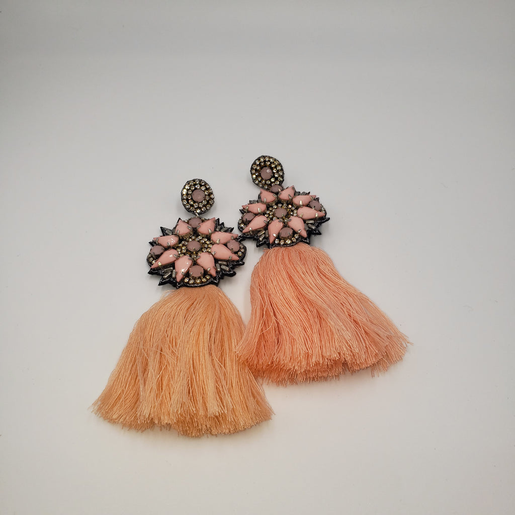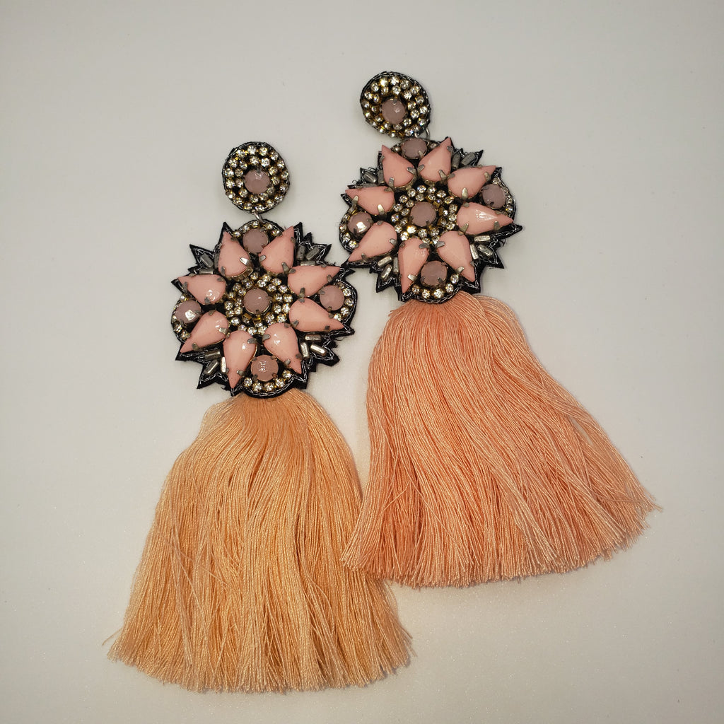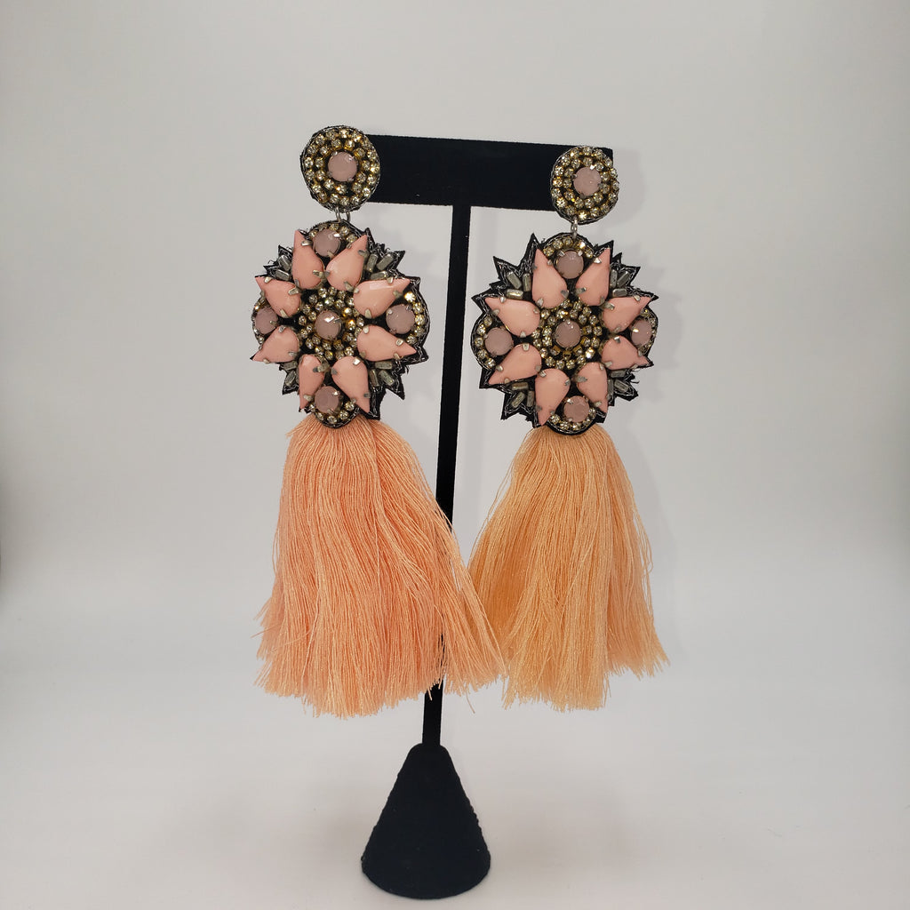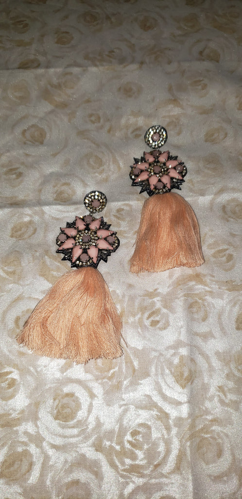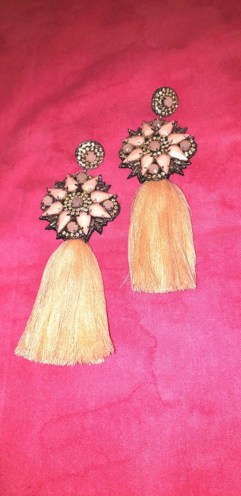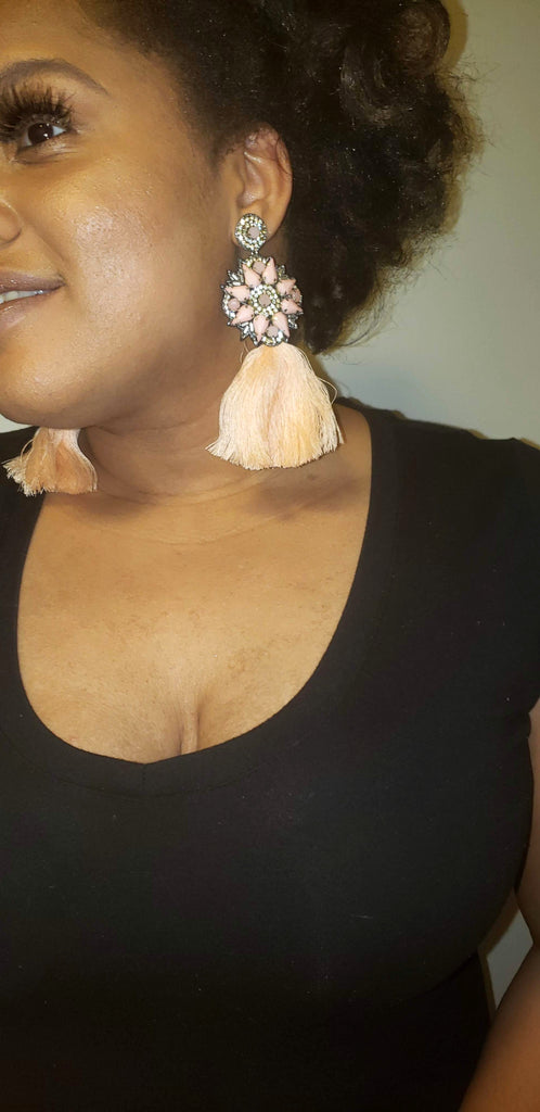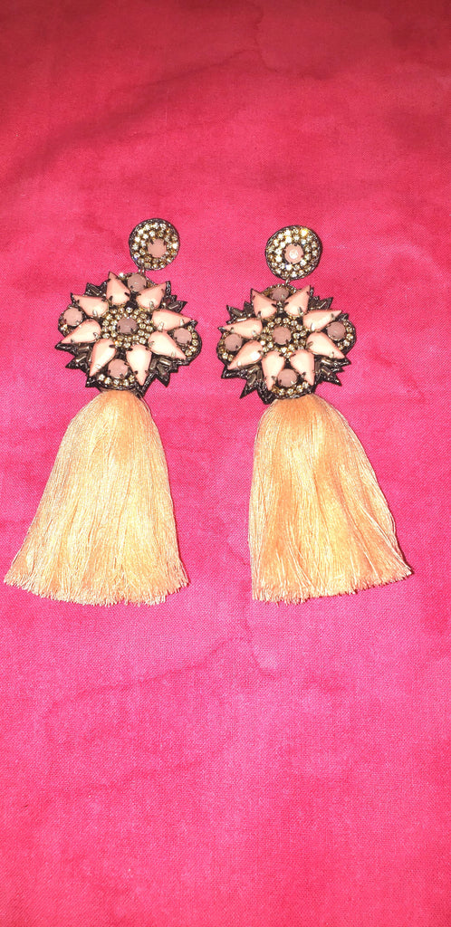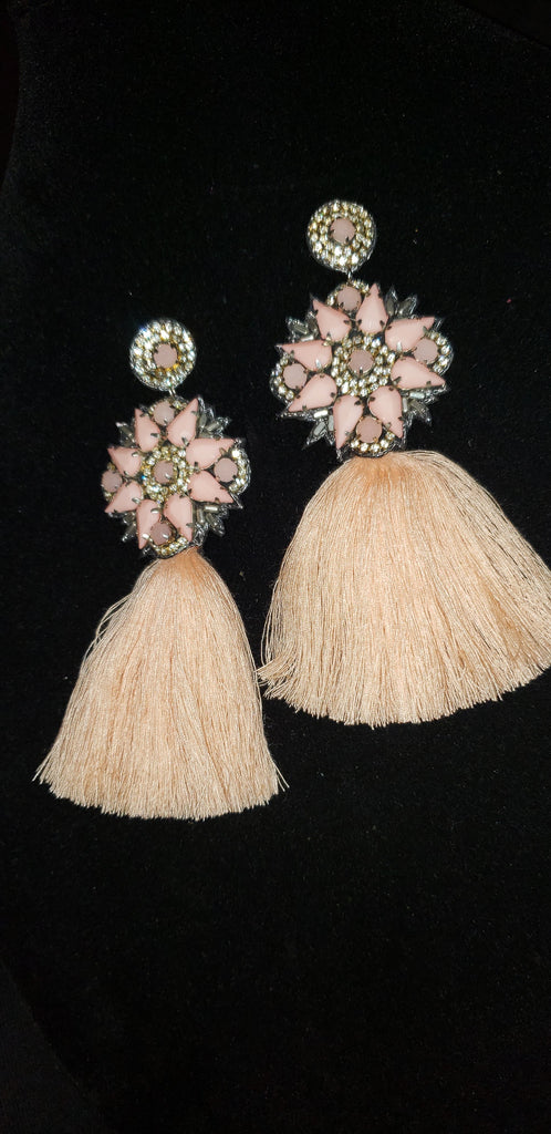 Light peach dangling tassel earrings with pink and rhinestone embellishments at the base