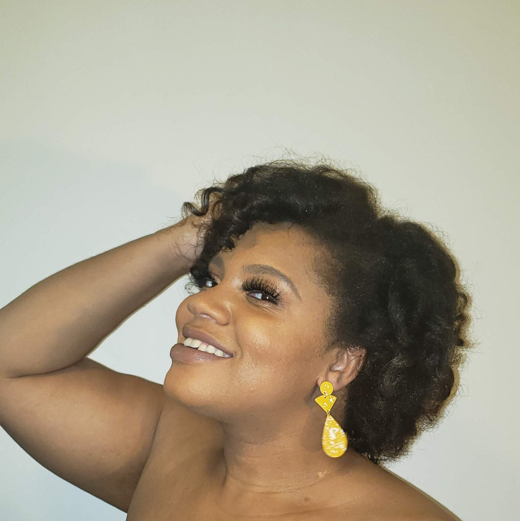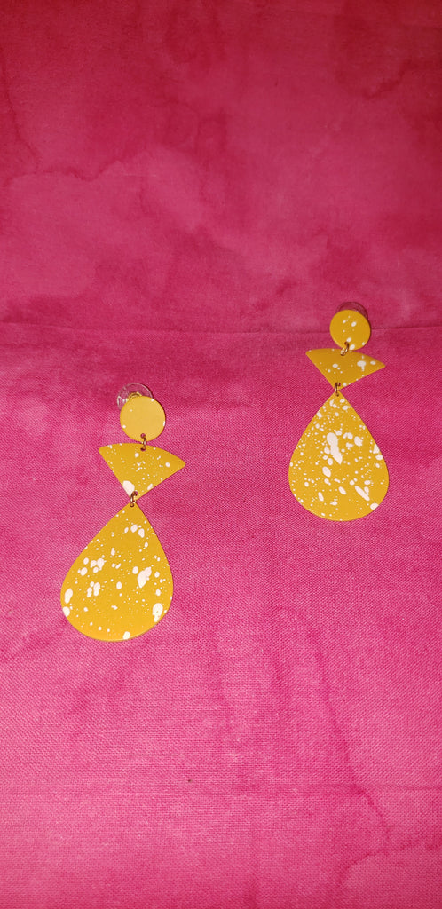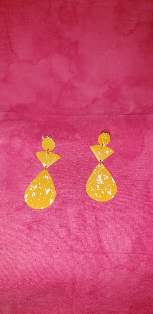Yellow dangling earrings with white paint speckles