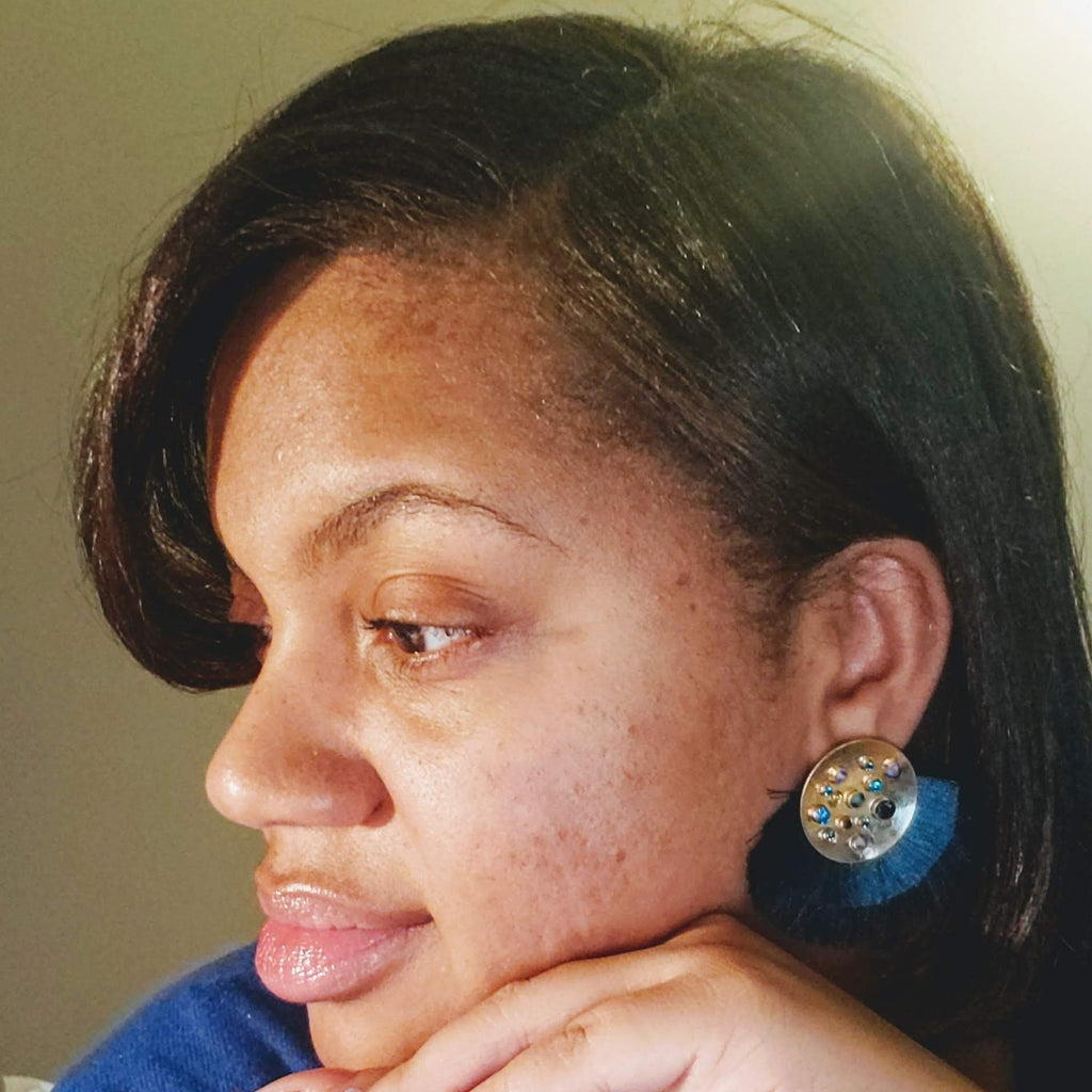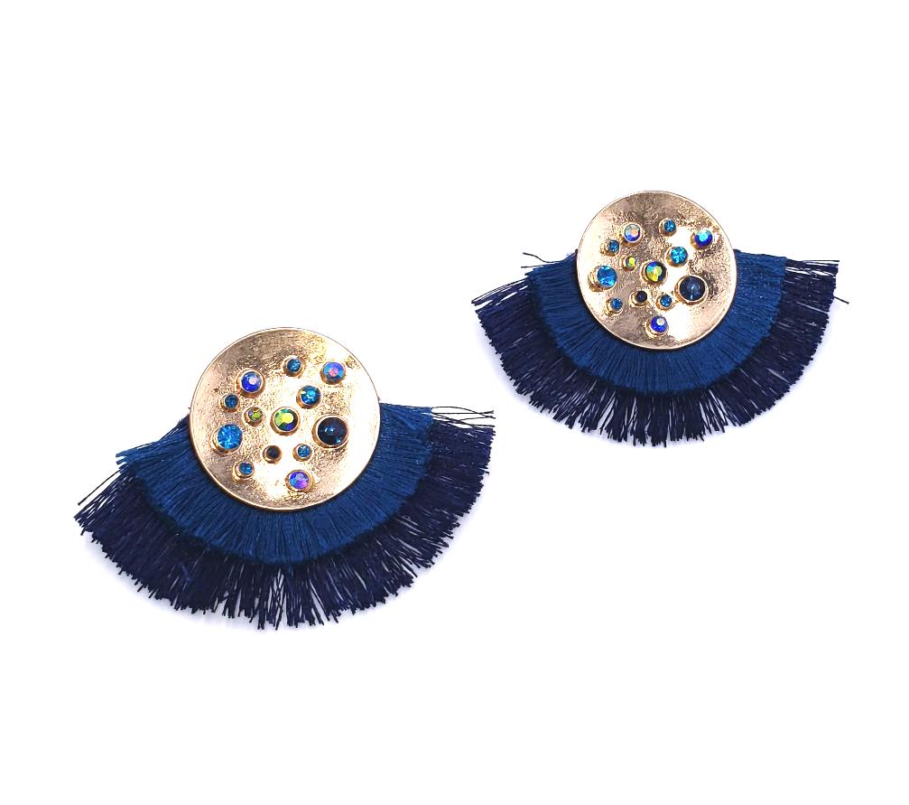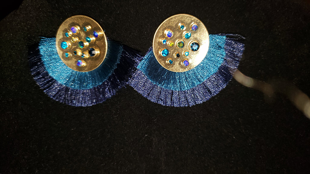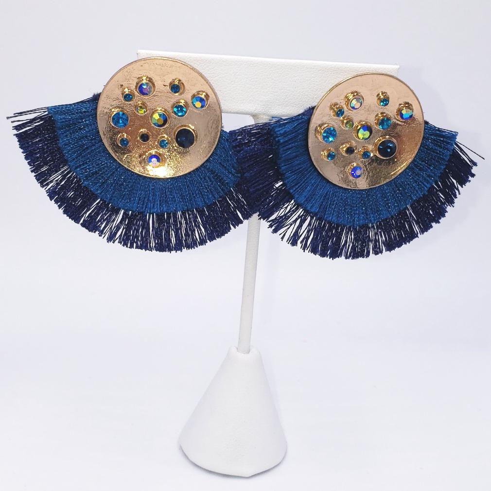 Medium sized faux gold pendant earrings with blue stone embellishments and fringes