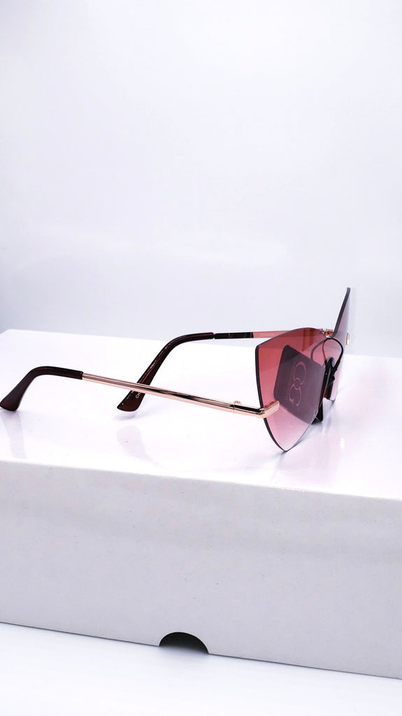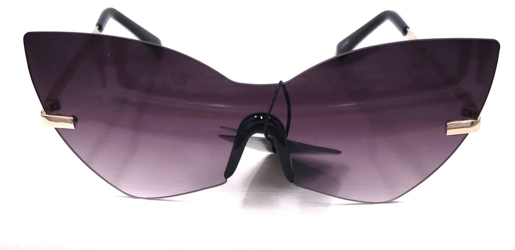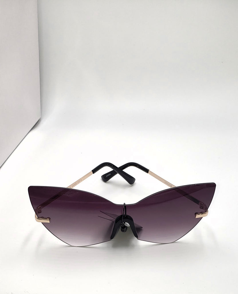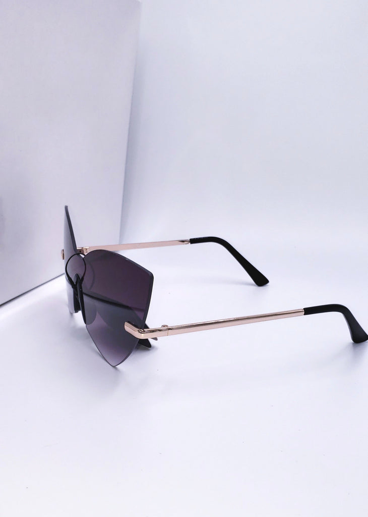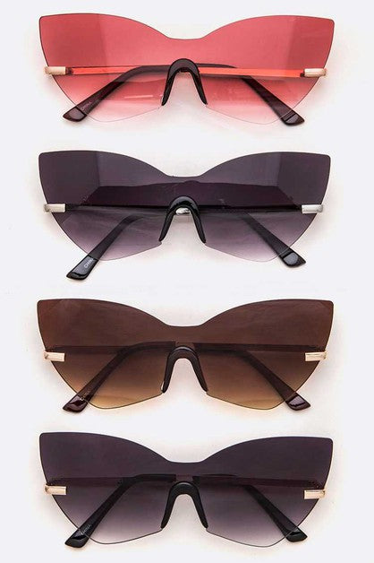 Cat eye shaped frameless sunglasses with gold wire arms. One Size. Classic Fit. UV 400 Protection. Lead & Nickel Compliant