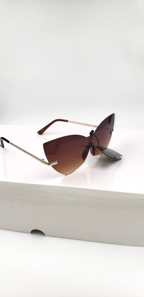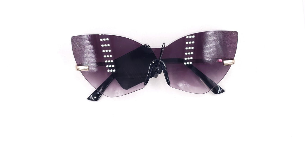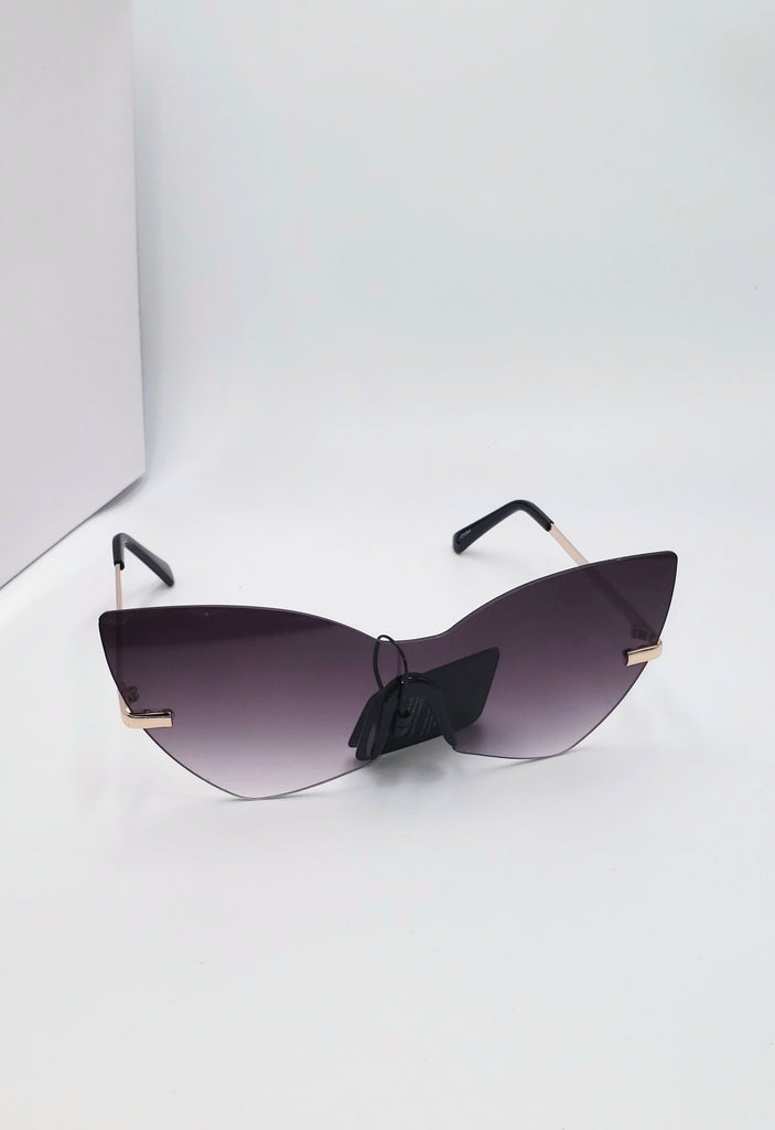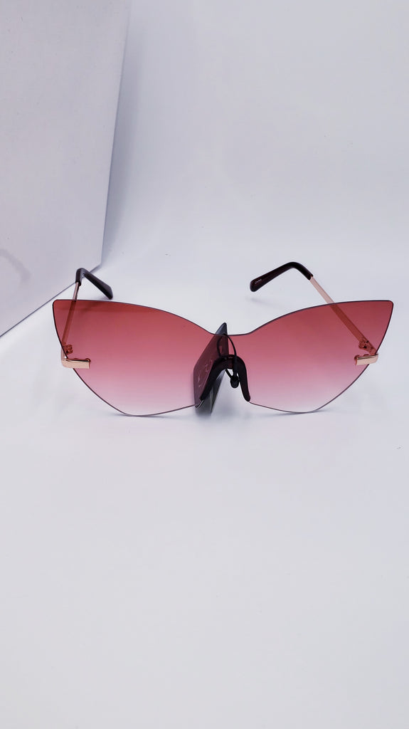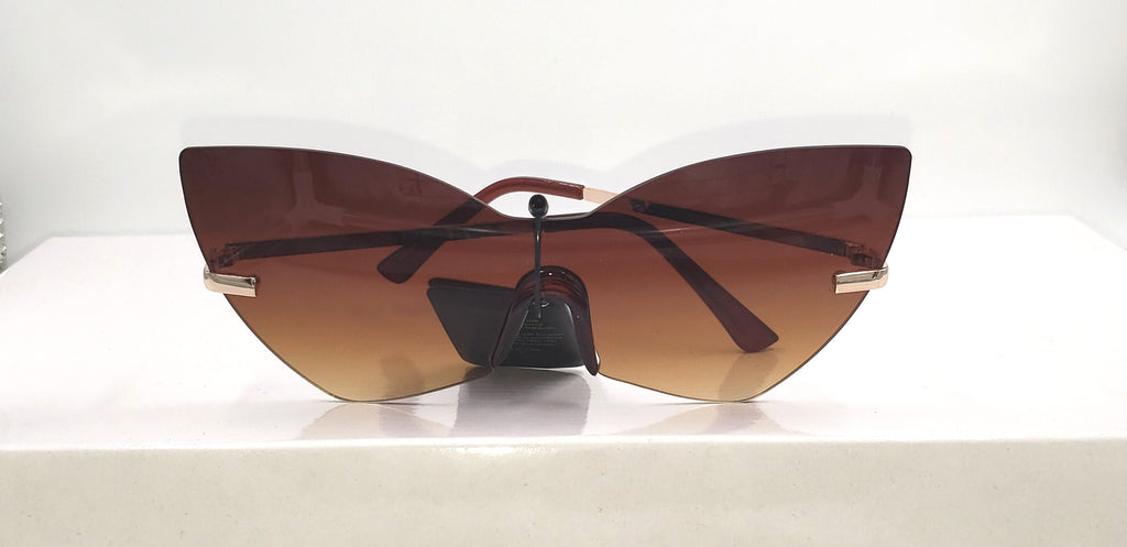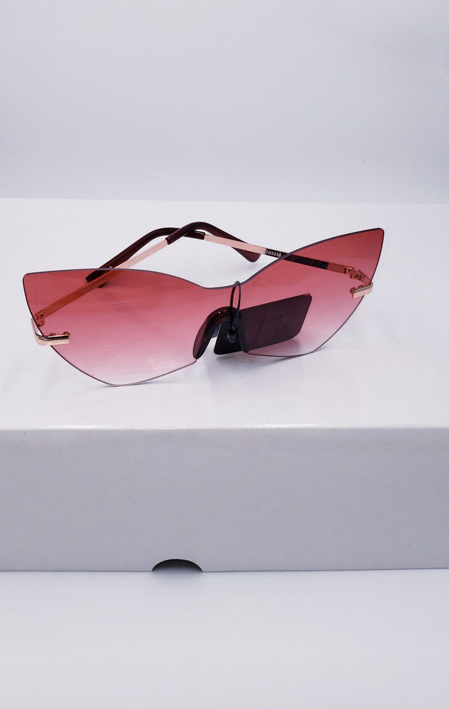 Cat eye shaped frameless sunglasses with gold wire arms. One Size. Classic Fit. UV 400 Protection. Lead & Nickel Compliant