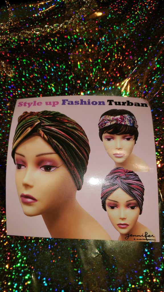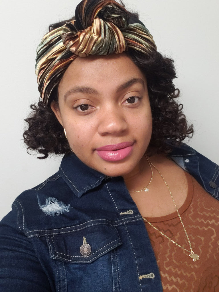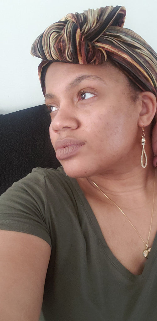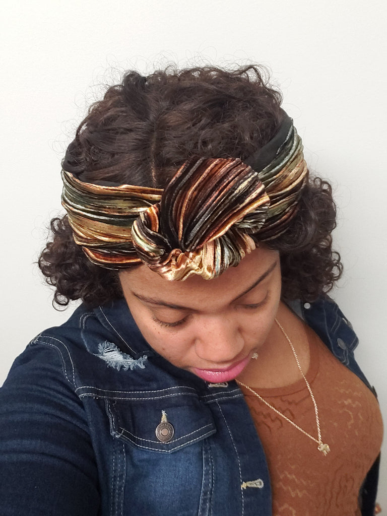 A gold and earth tone multi colored chic headwrap that can be worn multiple ways!