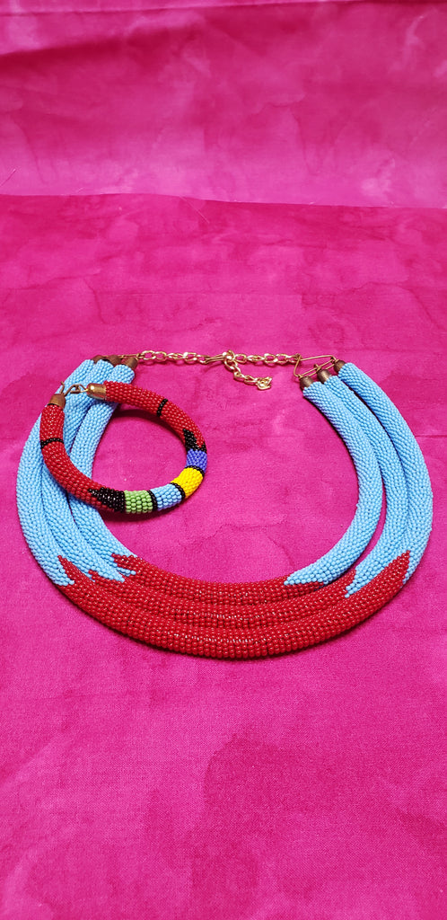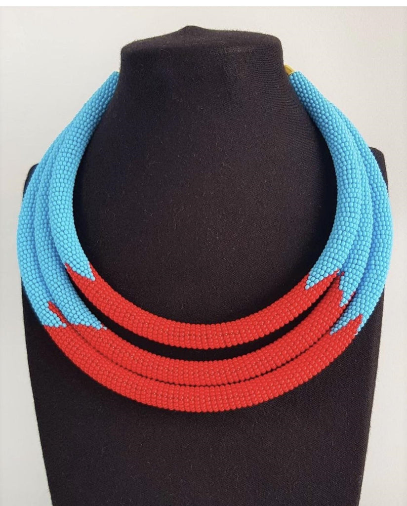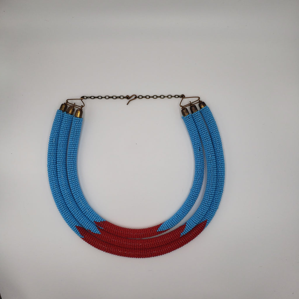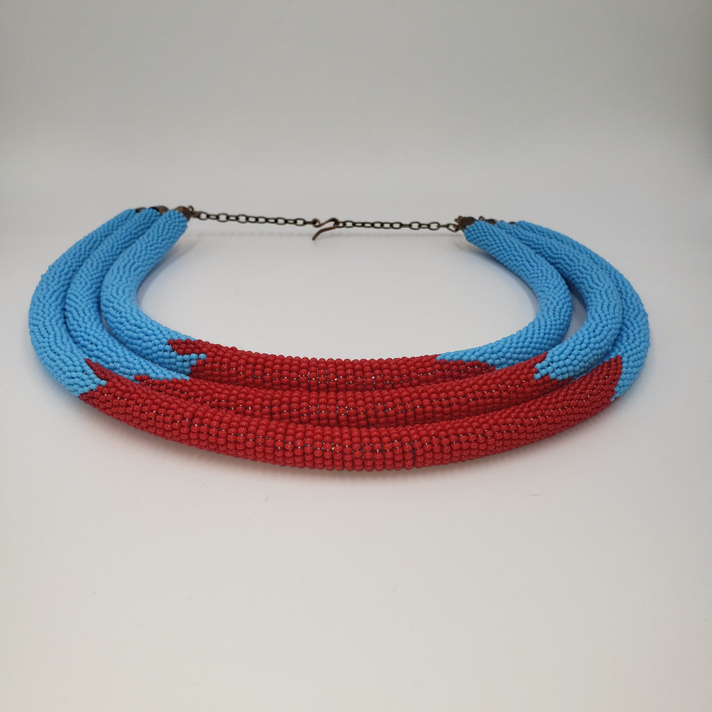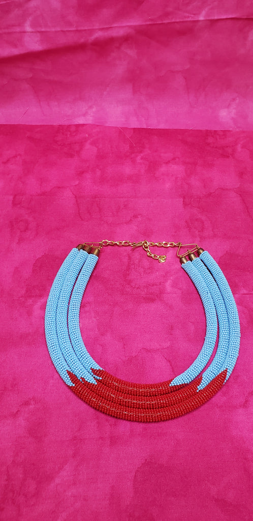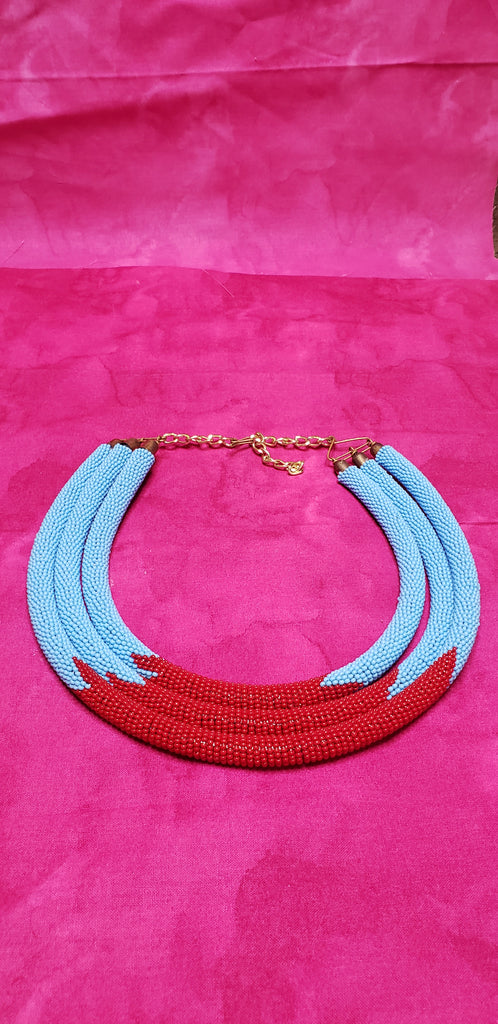Layered beaded sky blue and red bib rope necklace. One size fits all.