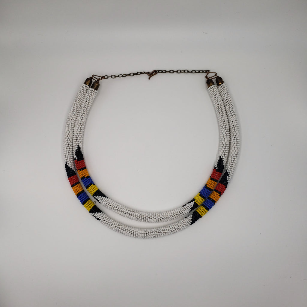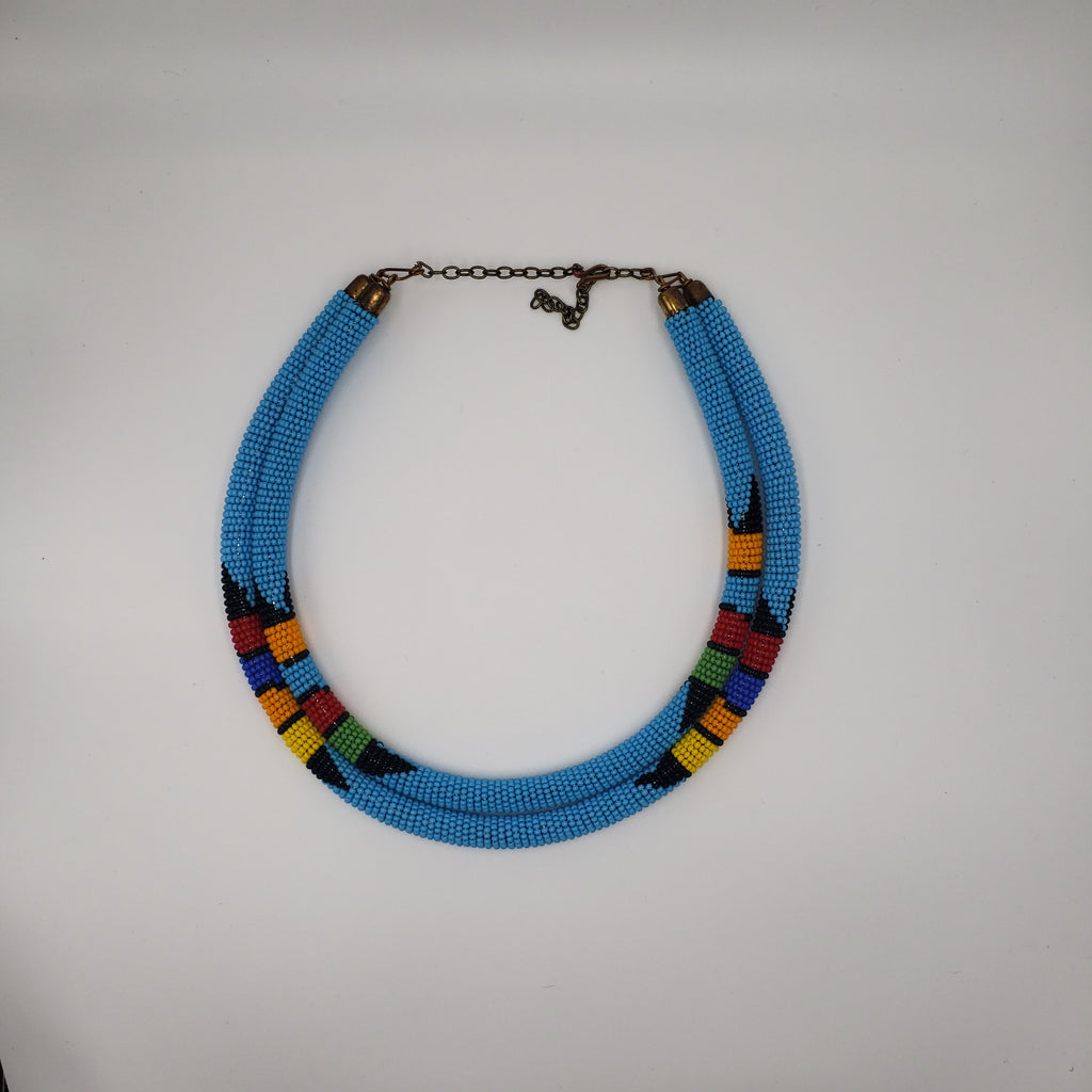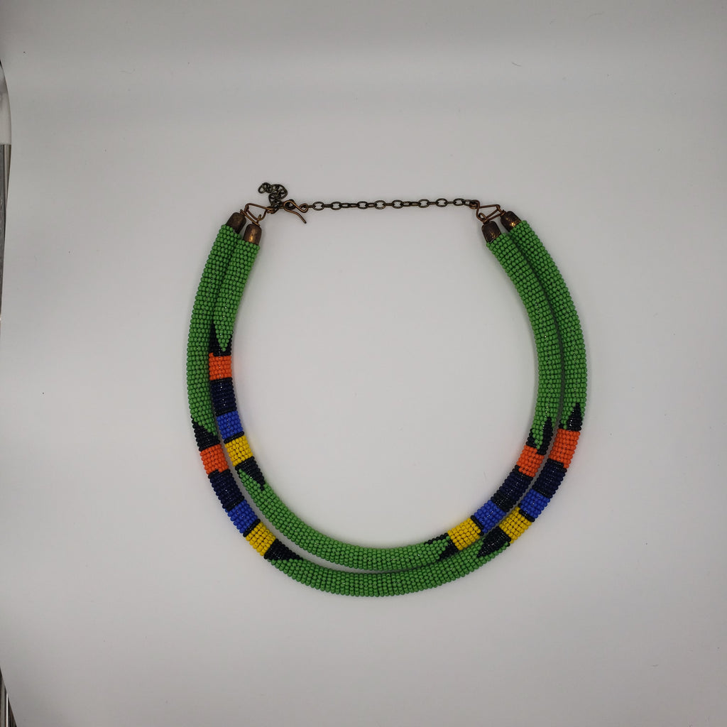 Beaded double layer collar necklace with brass finishes and adjustable clasp. One size fits all.