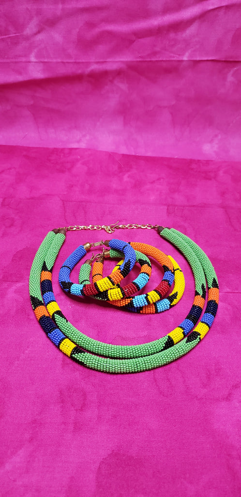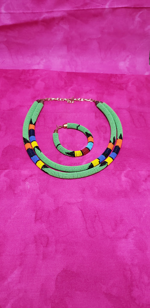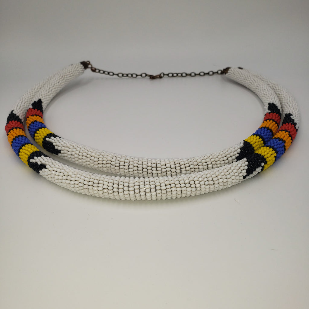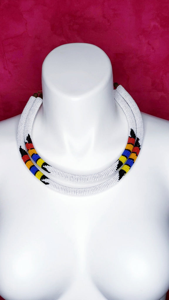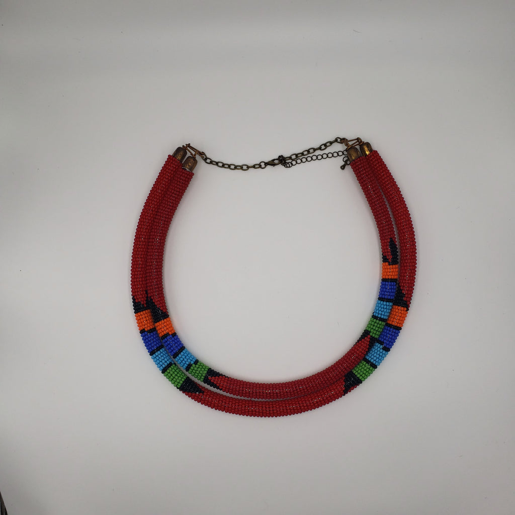 Beaded double layer collar necklace with brass finishes and adjustable clasp. One size fits all.