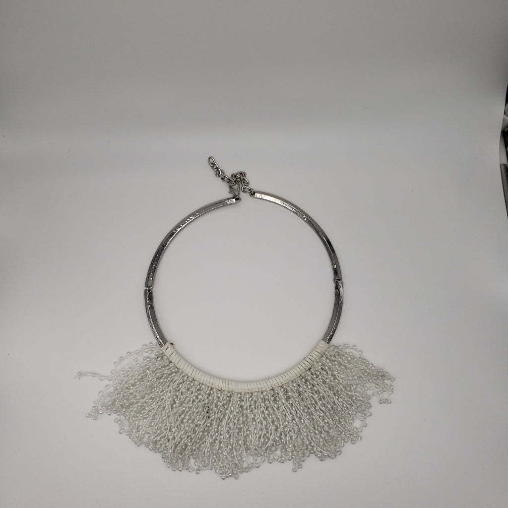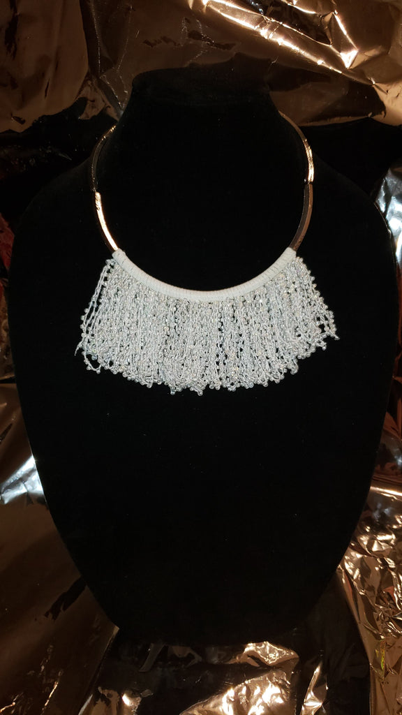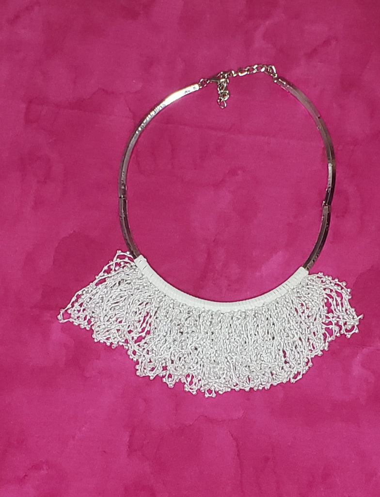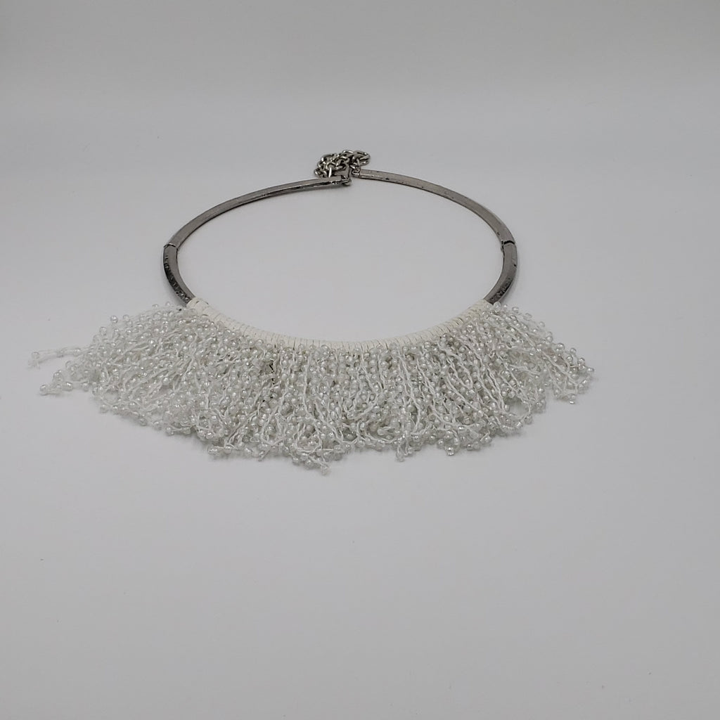 White beaded statement necklace with white faux leather embroidery around a silver collar. One size fits all.